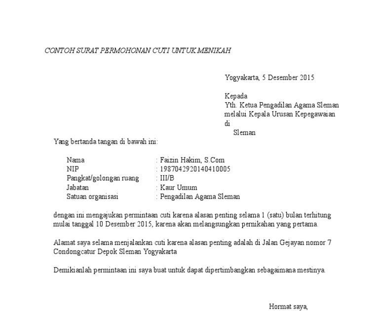 Contoh Surat Cuti Menikah Untuk Pns - Contoh Surat from i1.wp.com Contoh surat permintaan cuti yang saya berikan ini adalah contoh surat permintaan cuti diluar contoh surat izin cuti libur kerja bagi karyawan contohsuratmu. Download contoh surat izin cuti pegawai pemerintah (pns/asn) cuti melahirkan, cuti ibadah umroh dan haji, cuti urusan keluarga dan cuti melahirkan. Biasanya, satu alasan untuk tidak masuk kerja adtau sekolah adalah dikarenakan sakit. Cuti besar merupakan cuti yang diberikan kepada pns yang telah bekerja minimal 5 tahun secara terus menerus. Dan jika dalam hasil pemeriksaan dokter agar diperintahkan untuk istarahat atau dalam perawatan intensif dalam beberapa hari. Cuti sakit merupakan hak dari setiap pns yang mengalami kondisi sakit. Contoh surat izin tidak masuk kerja karena sakit. Untuk surat cuti pns ini, beberapa ketarangan.